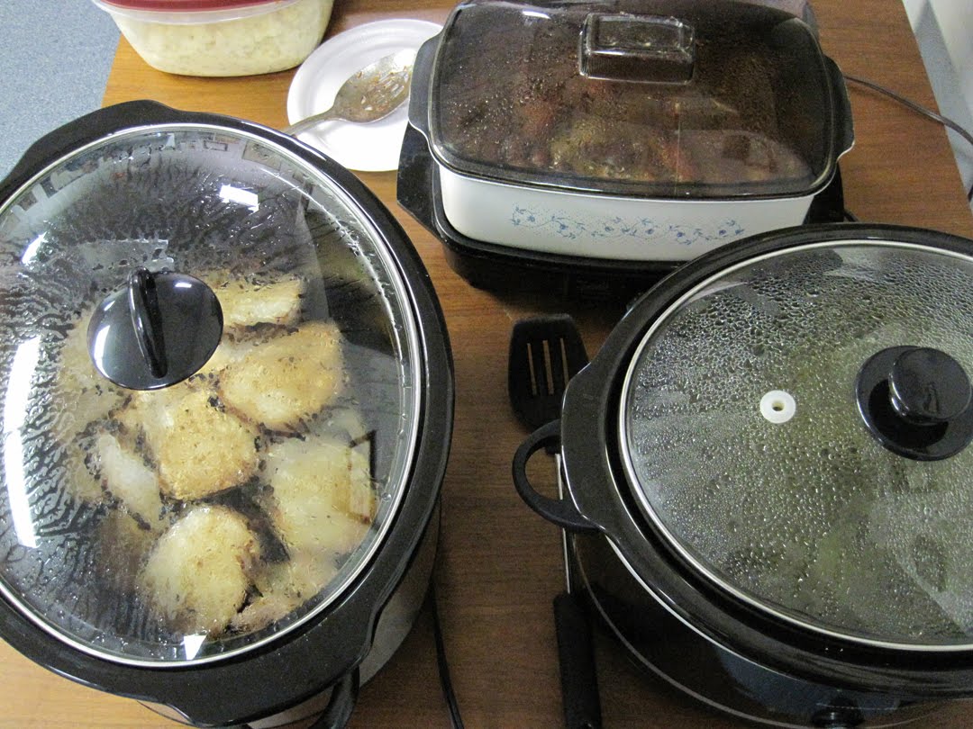 Pork loin and other crockpot meats were simmering on this table. We have often said it is hard to work when you're salivating over the food fragrances wafting through the air at 10 a.m.!