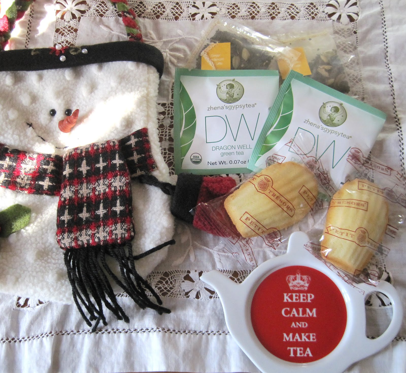 When my friend Maureen and I met for tea back before Christmas, she arrived bearing a delightful assortment of tea-related gifts, including this cute snowman bag, various teas, some madeleines (which were delicious!), some chai flavored mints and a fun "Keep Calm and Make Tea" teabag caddy. (Recognizing my longtime love of ballpoint pens, she also gifted me with one of those, a gorgeous handmade wooden pen made by a friend, but it was upstairs on my writing desk at the time I took these photos!)