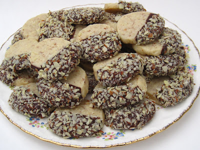 This cookie recipe caught my eye because it's one of those cookie doughs you shape into logs and then slice. I find these are easy and produce perfect cookies, so I was intrigued. Also, I should mention that the chocolate chip "dip" is created a bit differently than most. This one called for butter and hot water to be added to the chocolate chips, and I must say that when I microwaved it in 20-second increments, it created a dip that was absolutely perfect, not too thick and not too runny. I would never have added water to such a recipe, so it was fun to learn a new trick. And these cookies are absolutely scrumptious!
