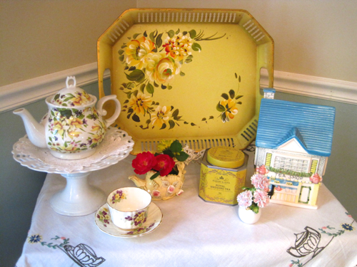 Beautiful tea trolley! Unlike most homes, mine doesn't have any yellow or red. The only yellow teaset I have is Royal Winton Sophie Chintz. But lately, I seem to be attracted to teacups with yellow roses! I will have to look for a china egg vase, so cute and unusual.