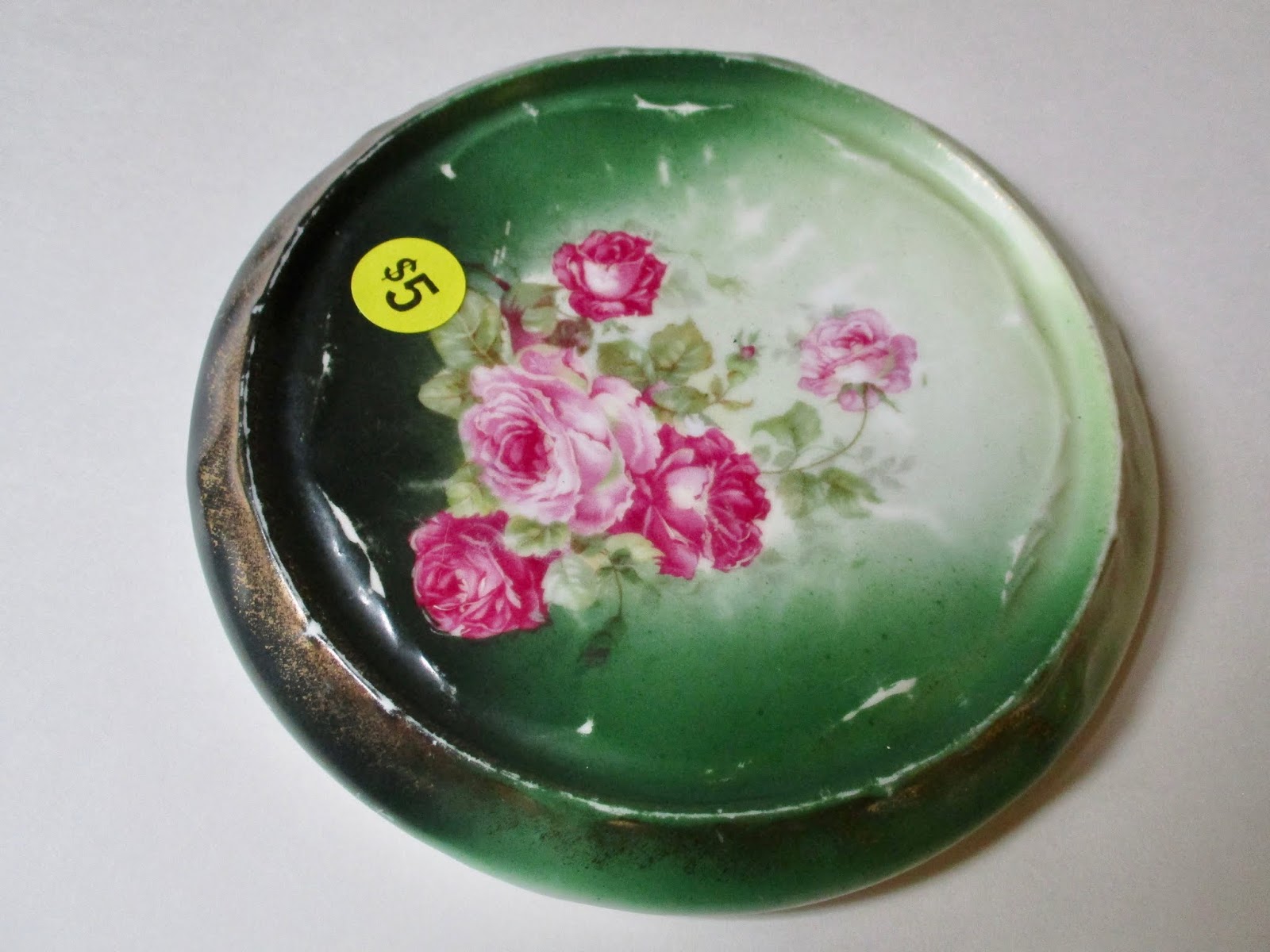 And while I have quite a few tea tiles, or tea trivets, I'd never seen one with these pretty old roses, and I love the fact that the background color is a bright emerald green. I'm redesigning my author website and want it to be green and vintage-looking, and I have just not found very many lovely old things that are emerald green, but this is perfect and may end up in the opening page photo. And if you look at the top photo, at bottom left, you'll see a tiny sliver of another trio I got. It has an intriguing back stamp and backstory, so I'm researching that before I share more about it. So as you can see, I was quite thrilled with my lovely array of goodies from Patti's cleaning-out prior to her move, and now I have some fun research to add to this week's tasks. I think I like a good backstory as much as I like pretty tea wares!