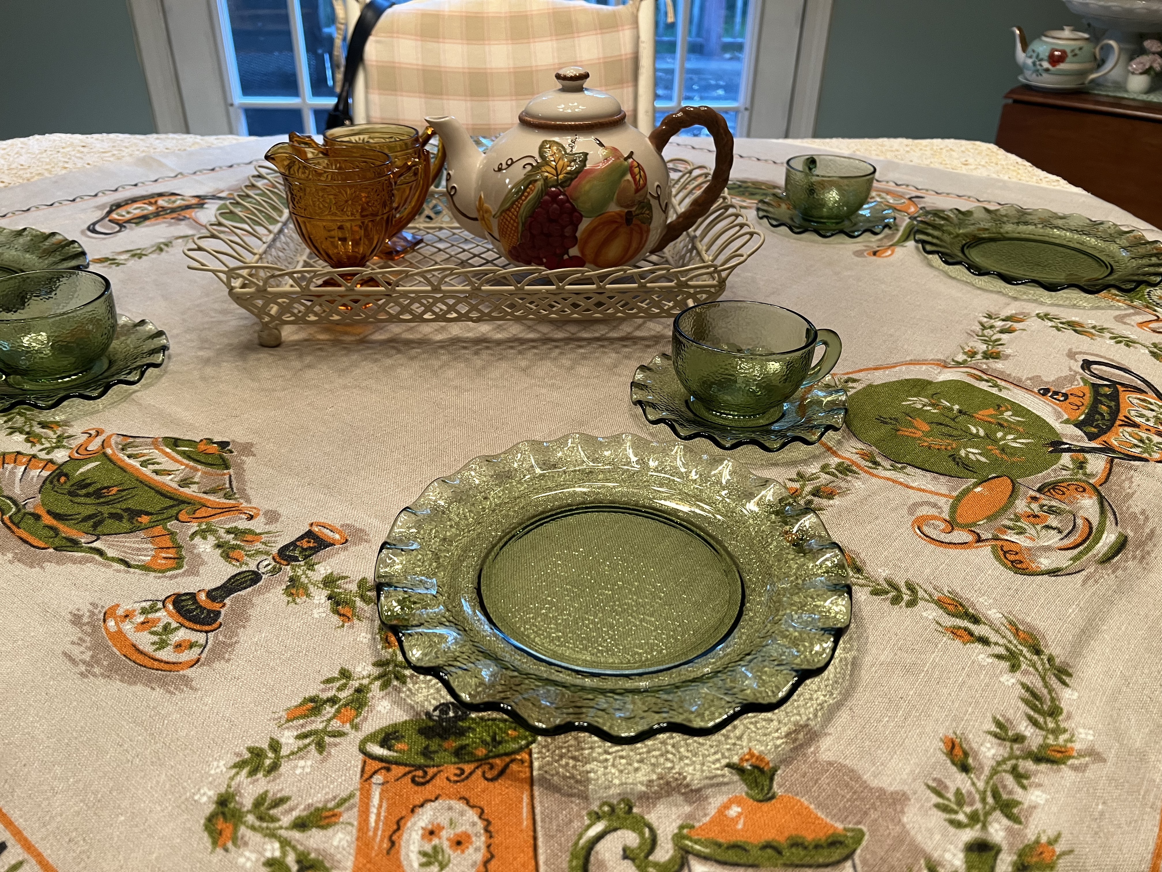 1. Oh, that tablecloth is perfect! I love vintage linens anyway, and this one is just right for your table - colors, designs, etc. I'm so glad you are enjoying your pretty green glass pieces.